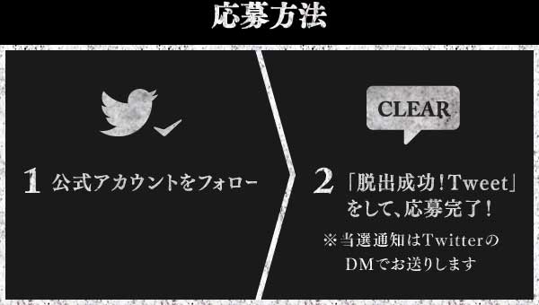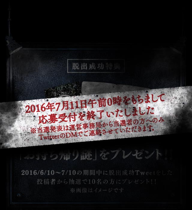 【キャンペーン期間】 2016/6/10(金)~2016/7/10(日)23:59(日本時間) 【賞品・当選人数】 「お持ち帰り謎」を10名様 賞品の発送につきましては、7月下旬~8月上旬を予定しております。 ※諸般の事情によりお届けが遅れる場合もございますので、予めご了承ください。 【応募方法】 ・STEP 1 「時解 eScape cafe」のTwitter公式アカウント@escape_cafeをフォロー ・STEP 2 「脱出成功!Tweet」ボタンからツイートして、応募完了! ※ご当選者様にはTwitterのDMにてお知らせ致します。 【当選発表】 キャンペーン終了後、2016年7月下旬より順次、当選連絡をいたします。 厳正な抽選の上、当選者の発表は運営事務局から当選者の方へのみTwitterのDMでご連絡させていただきます。 【注意事項】 ・応募にはTwitterアカウントが必要です。 ・Twitterアカウントを非公開にしている場合、ツイートを確認することができないため、本キャンペーンには参加できません。 ・ご当選者様の住所、転居先不明、長期不在などにより賞品をお届けできない場合には、当選を無効とさせていただきます。 ・厳正な抽選のうえ、当選者を決定します。 ・抽選結果に関するお問い合わせにはお答えできません。 ・ご当選の権利はご当選者様ご本人のものとなり、ご家族、ご友人等への譲渡、転売、換金はできません。 ・賞品は予告なく変更となる場合がございますので、あらかじめご了承ください。 ・当キャンペーンは、Twitter社とは一切関係ありません。 【個人情報の取り扱い】 ・お客様の個人情報を、お客様の同意なしに、業務委託先外の第三者に開示、提示することはありません。 (法令などにより開示を求められた場合を除く) ・その他、お客様の個人情報の取り扱いについては、下記のURLをご参照ください。 http:// www.shikairow.com/policy.html